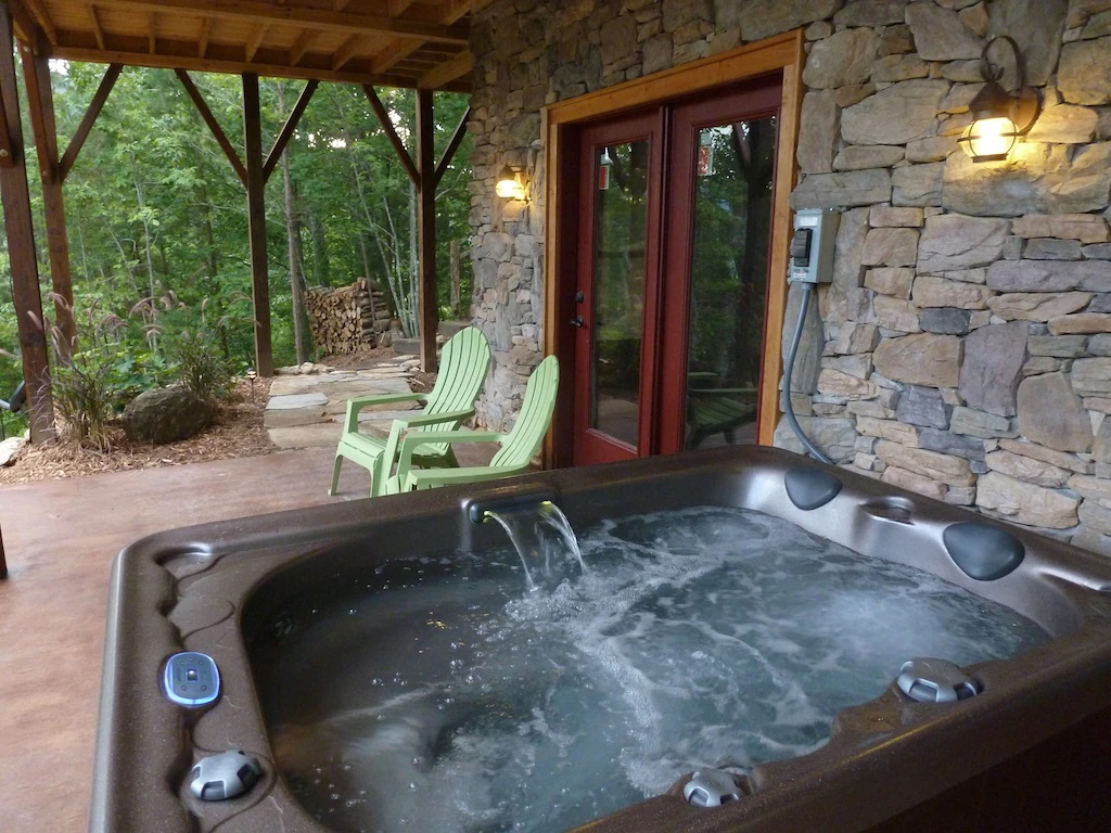 River Magic is nestled on 4 acres with river and majestic mountain views. New, authentic log cabin with cathedral beamed ceilings, great room and stone wood burning fireplace. Large gourmet kitchen with stainless steel appliances and Corian countertops. Romantic master suite with log bed and luxurious mattress. Large covered porch and open deck with outdoor furniture to view the stunning mountain and river views.