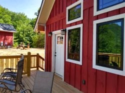 SkyView (600 square feet) with its inviting red color, welcomes you to enjoy all the comforts of home in your own private space. Relax in front of the propane stove in the vaulted great room, settle into the king bedroom, and enjoy the full bath after a day of mountain adventures. Well suited for that couples getaway, perhaps a special place for a wedding night, anniversary, or honeymoon. A futon in the great room provides an additional sleeping platform. Small weddings are a possibility as well.