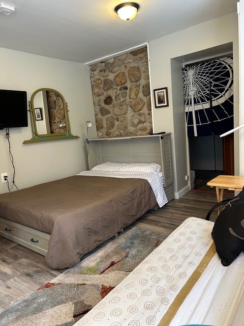 Sleeps two-three (a queen size bed and a comfortable fold-out), private entrance, full kitchen and bath, outdoor patio with gas grille. Just a short walk to Hot Springs businesses and restaurants and adjacent to the beautiful grounds of Laughing Heart Lodge and the AT. The Studio offers a cozy accommodation for area sites, events, hiking and other activities. 2 night minimum stay.