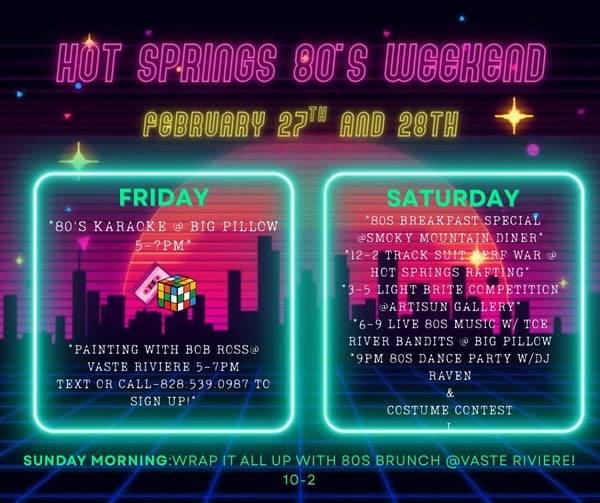 The celebration of “All things 80s”: the music, the hair, the games/toys, the clothes, the food/drink, the movies, the TV/Game shows, even the vocab…we definitely cover it all!  What better town to celebrate the 80s than Hot Springs, NC where our unofficial motto is, “Where Mayberry meets the Twilight Zone”!     A weekend full of everything 80s–TOTALLY AWEOME!