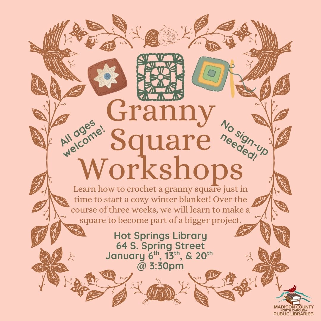 Don’t miss these weekly granny square workshops at the Hot Springs Library in January. Drop in at 3:30pm and work on your squares with friends for a fun winter project! We will meet on January 6th, 13th and 20th in Chestnut Hall, no registration is required.