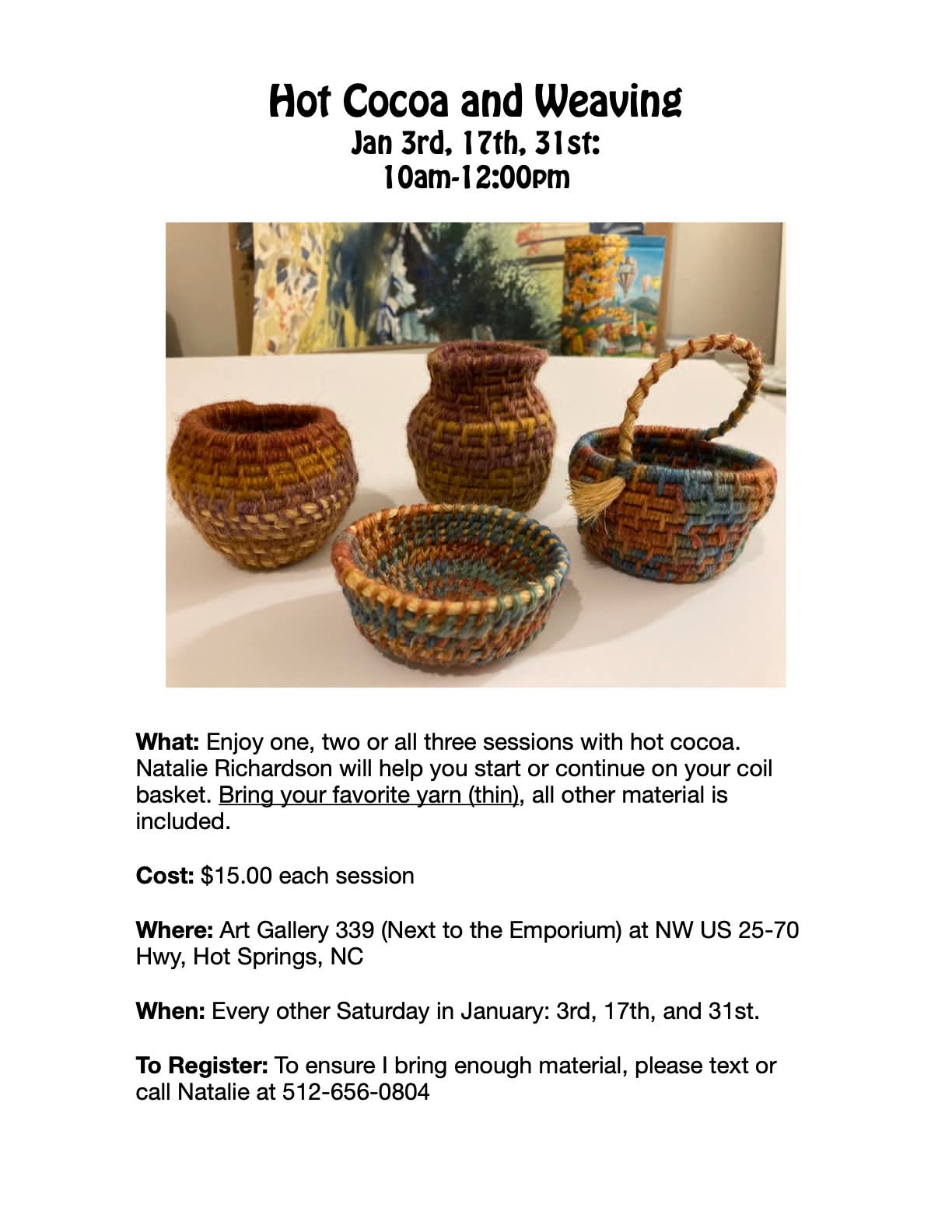 Enjoy hot cocoa in a cozy circle while learning how to coil basket weave with Natalie Richardson.